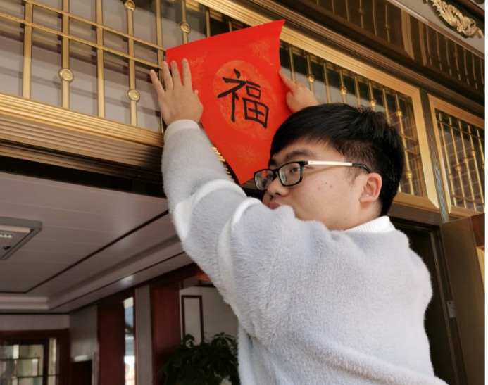 图为实践队员帮助邻居贴“福”字 中国青年网通讯员 张裕 摄