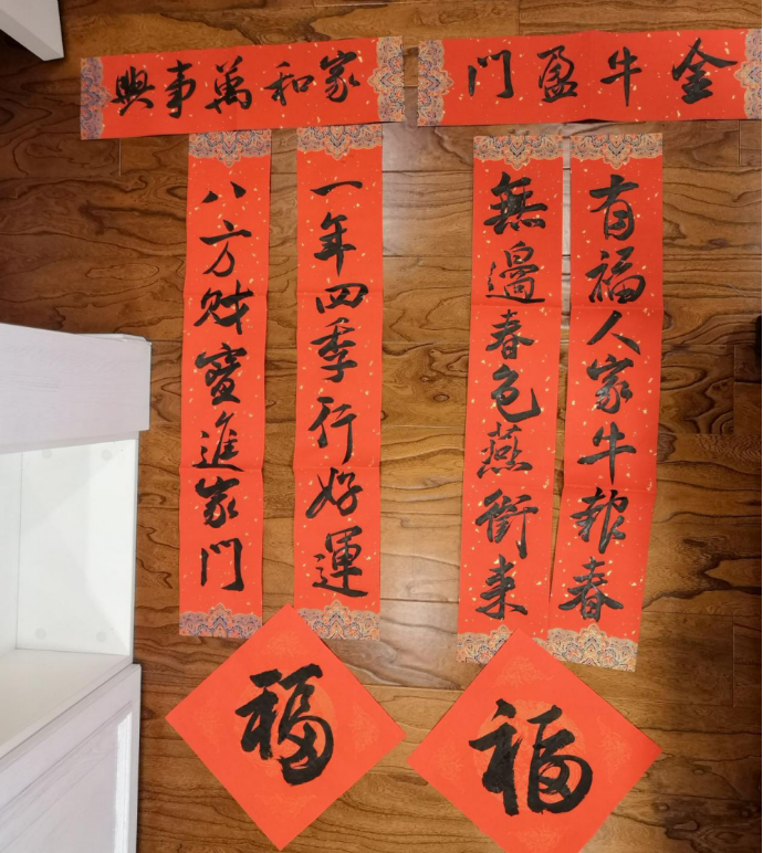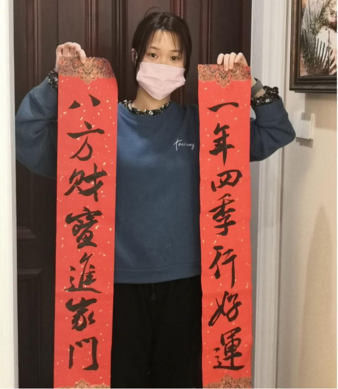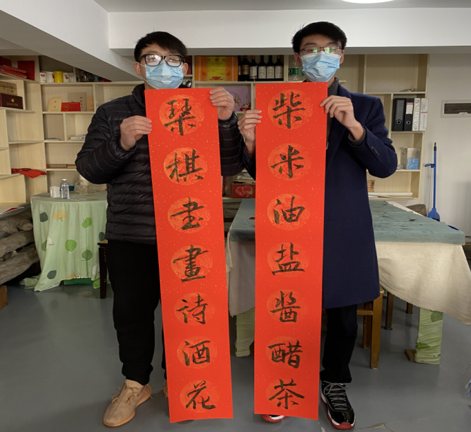 实践负责人张裕带领着队员们在当地书法老师的指导下一起挥毫泼墨,书写春联。队友们饱蘸浓墨、提笔挥毫,随着笔锋的时抑时扬,一幅幅优美的书法对联跃然纸上。在这之后大家将晾干的春联收好放进收纳袋,分发给各自的亲朋好友以增进感情并拍照留念。此次实践活动的意义在于让学生们亲身体验书法的魅力,增加了对书法国粹的了解,同时在节日气氛的烘托下,也增进了亲友之间的和谐关系,充分展现大学生风采。相信本次活动会给亲朋好友带来美好的祝福、给寒冬带来无限的暖意!