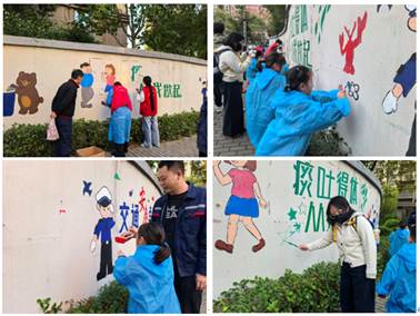 2025年10月,艺术学院“青马工程”联合视觉传达2402团支部与产品设计2402团支部在象山社区、武将社区举办了“社区文明”主题墙绘活动。30多名志愿者,奋战2天,通过色彩斑斓的图案展现交通安全、垃圾分类等文明场景,使原本单调的墙面焕发出新的生机,成为传播社区文明的生动载体。