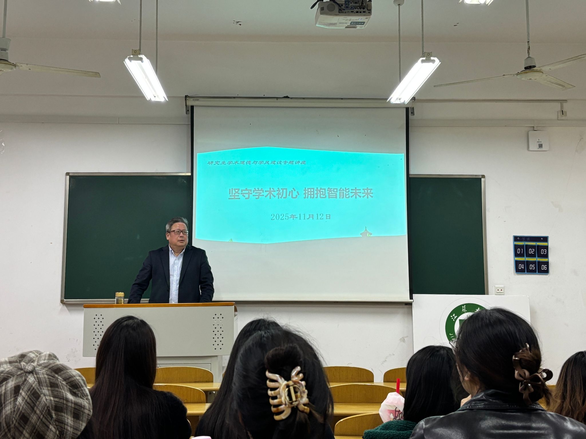2025年11月12日下午,江苏大学艺术学院在1101教室开展“坚守学术初心·拥抱智能未来”研究生学术道德与学风建设专题讲座。本次讲座邀请校党建专员、学院关工委常务副主任朱立新副教授担任主讲人,学院全体研究生到场参加。
