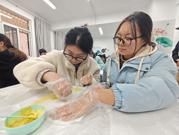 12月2日,为推动优质美育资源从课堂走向生活、从专业领域下沉学生社区,江苏大学艺术学院以第三届创“艺”美育节为载体,依托学科底蕴与专业师资,联合“美育润心”辅导员工作室、毓秀书院,共同开展“非遗蓝染进社区”主题活动。活动特邀艺术学院李明珠副教授主讲,通过“理论讲解+案例分析+实践操作”三维模式,带领30余名师生“沉浸式”体验型糊染DIY非遗印花技艺,让素雅靛蓝在学生社区绽放传统文化与现代美育交融的光彩,为校园美育生态注入活力。