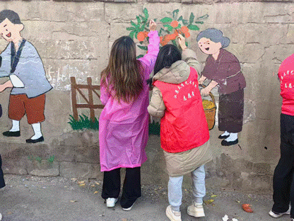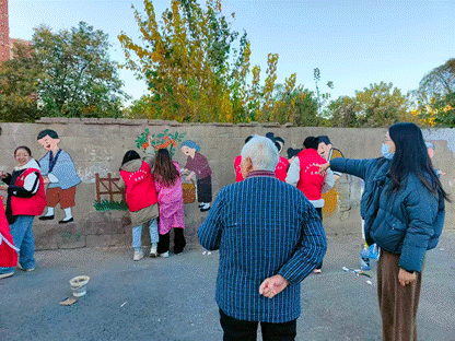 活动中,志愿者们围绕“社区共建”“绿色生态”“孝老爱亲”三大主题展开创作。在长约二十米的围墙上,一幅展现邻里互助的场景逐渐成型:年轻人帮助老人提重物,儿童在社区花园嬉戏,画面色彩明快,充满生活气息。另一侧墙上,青山绿水与飞鸟花卉相映成趣,展现人与自然和谐共生的美好愿景。“我们希望通过艺术语言,让居民在日常生活中感受到温暖与美好。”团支书东佳怡说。
