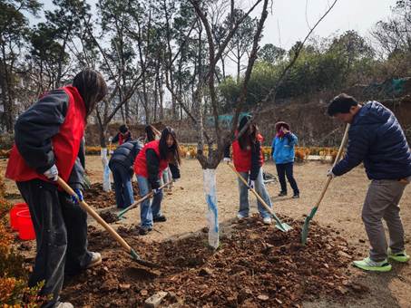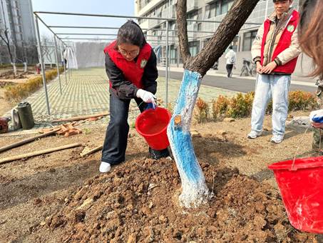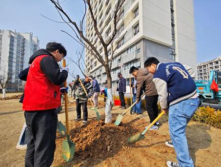 活动现场,学院领导老师与志愿者们组成“双馨先锋”党团共建小队,分工协作、干劲十足。领导老师带头挥锹铲土、扶苗扶正,与学生们并肩劳作,手把手指导栽植技巧;学生党员冲锋在前,团员志愿者紧跟其后,默契配合完成培土压实、提水浇灌等工序,现场一派热火朝天的劳动景象。