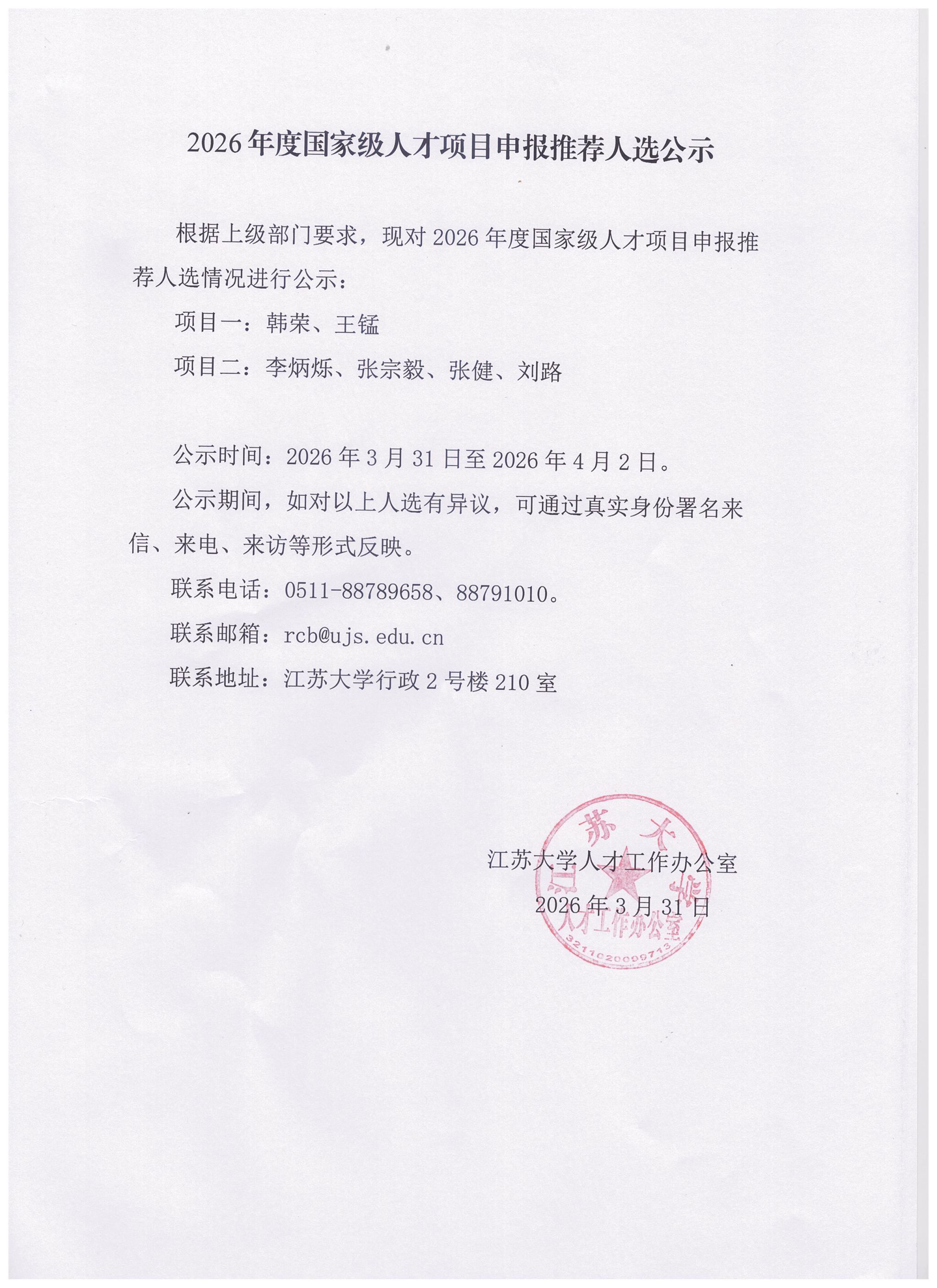 2026年度国家级人才项目申报推荐人选公示